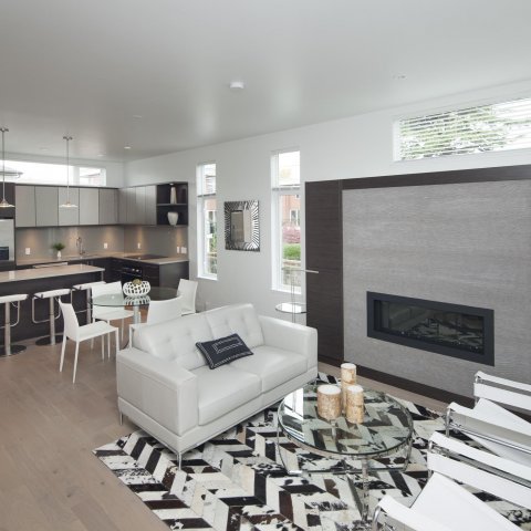 Gourmet kitchens open into the main living area and include textured metal cabinets, energy-efficient stainless steel appliances and quartzstone countertops. Contemporary fixtures and appliances, wide-planked, engineered oak flooring, recessed lighting and linear gas fireplaces lend stylish sophistication to the main level.